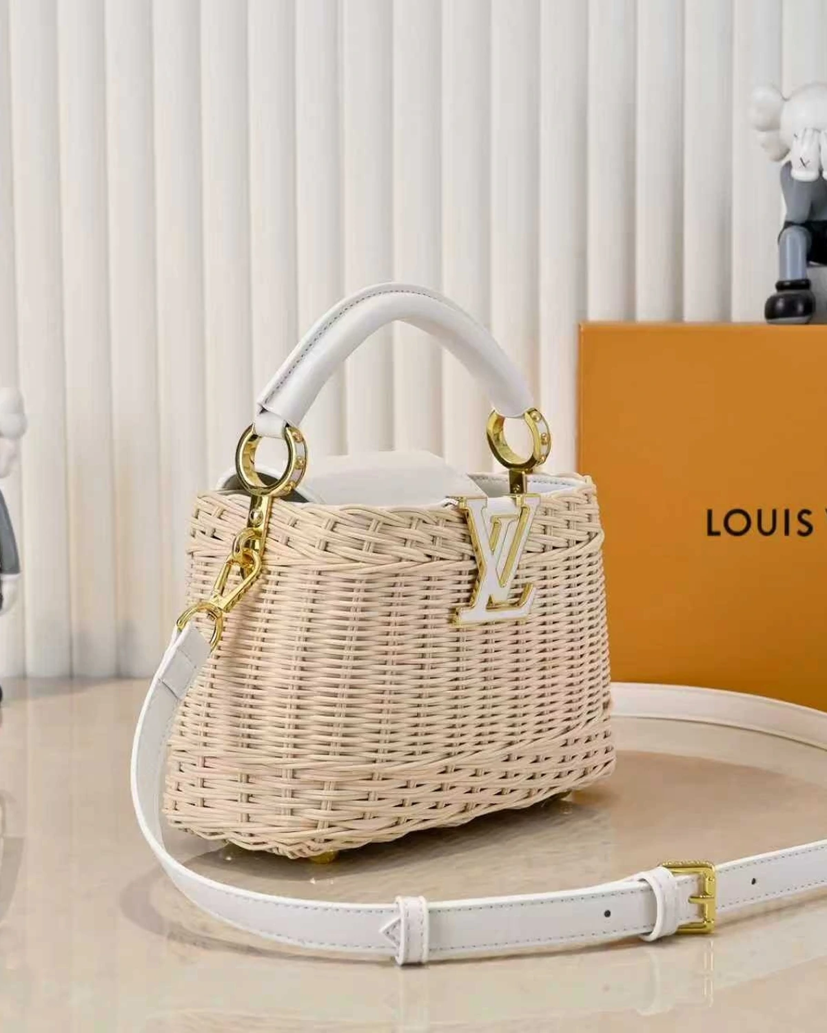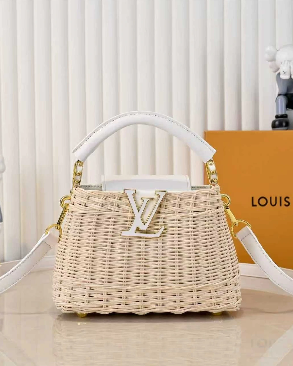 This Capucines Mini bag is inspired by historic Picnic trunk, launched in 1892. Its unique design, meticulously handcrafted from rattan over two days, features leather trim and an iconic Initials logo with an elegant gold-tone finish. Perfect for summer, this style can be worn across the body, over the shoulder, or by hand.