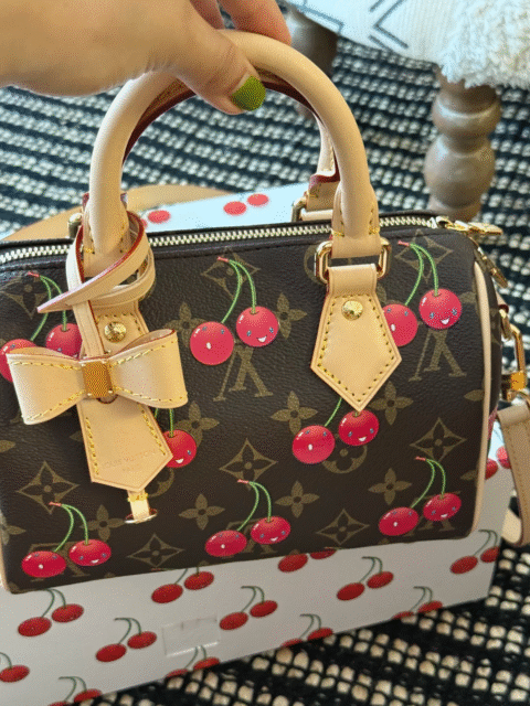 The rebce Speedy Bandoulière 20 “Cherry Monogram” reimagines the classic silhouette with a playful, limited-edition twist. Crafted from durable monogram-coated canvas with cherry-inspired accents, this compact yet functional bag is perfect for daily essentials. Featuring cowhide leather trim, textile lining, and gold-tone hardware, it includes double top handles, a removable strap for crossbody wear, and a decorative keybell. Its bijou proportions make it ideal for carrying a smartphone, long wallet, and keys, offering both practicality and charm. A true standout for those who love collectible handbags with a touch of fun.